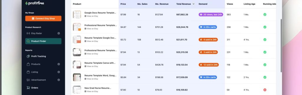 I used Profit Tree’s product research tool, which pulls real-time data from Etsy and shows you exactly how much a product is earning and how often it’s selling. Lucky for you, I already went down that rabbit hole so you don’t have to.