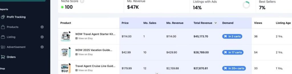 The top-performing listing is a travel agent starter kit bundle that’s made over $45,000.