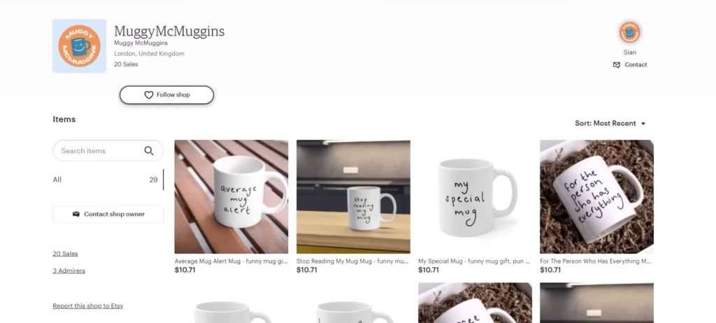 Let me show you why with a real example. I found a mug from an Etsy print-on-demand store called Muggy McMuggins. This store is pretty much empty—no reviews, barely any branding, no welcome message, no store banner. It looks incredibly untrustworthy and unprofessional. If they’d put in even a little effort, they could’ve made way more money.