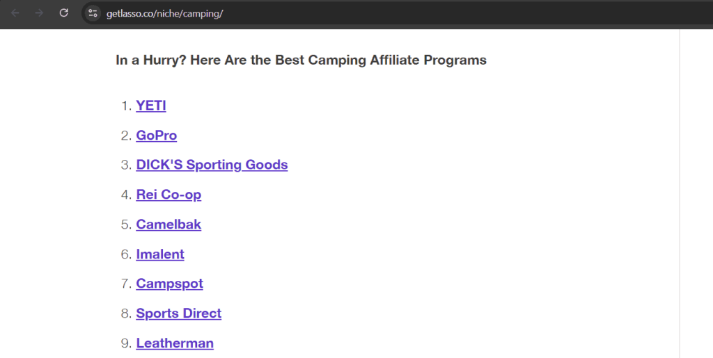 Go to Google and type in “list of camping affiliate programs” — or whatever your niche is. You’re going to get results that give you lists of different affiliate programs in that niche.